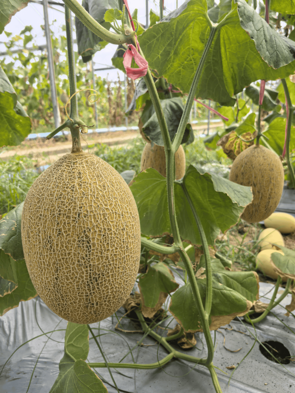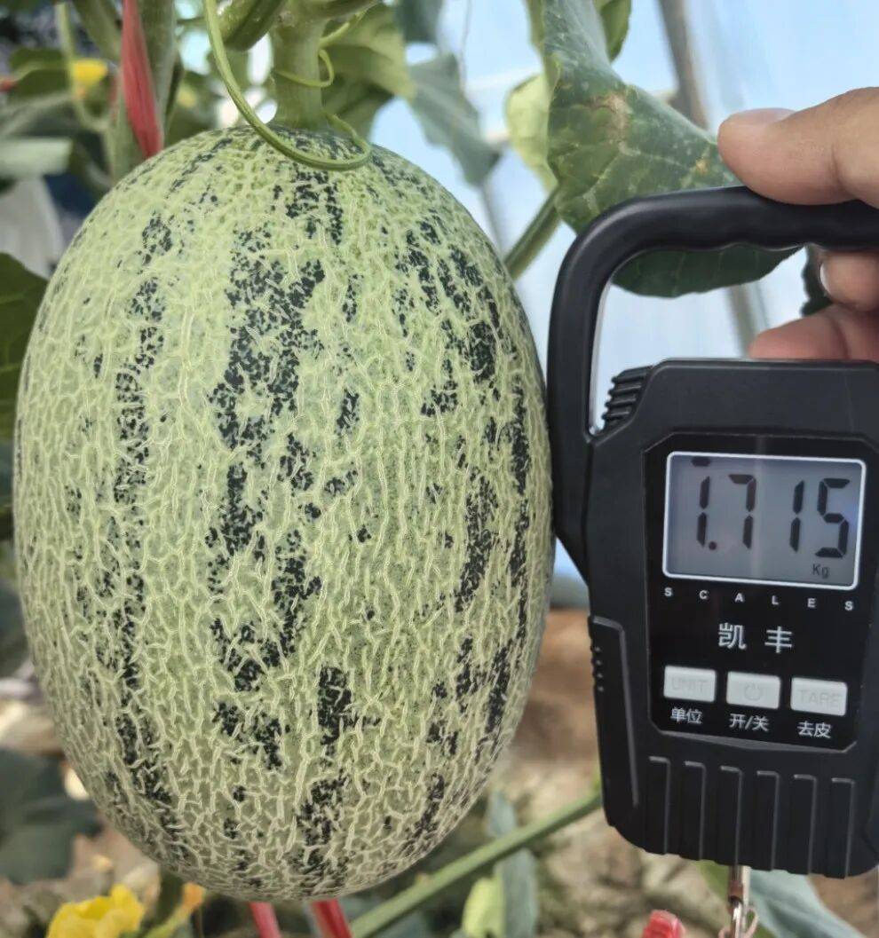 该品种为网纹甜瓜,品种名为‘脉珑3号’,市场商品名为‘牛三蜜瓜’。该品种在口感风味各方面上均有别于日本网纹甜瓜,例如:①风味:没有日本网纹甜瓜的酒味而是国人更喜爱的果香味②糖度:日本网纹甜瓜的糖度多13度左右,而目前‘脉珑3号’的采收标准为15度。品种特性:其表面丰富的木栓组织决定其优于其他品种的耐储性,独特的果香味使其从众多品种中脱颖而出成为每年‘最高采收价’品种。
