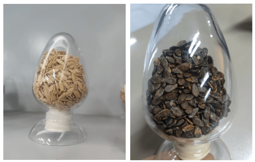 公司自主研发的瑾璨明珠甜瓜种子,种粒饱满、有光泽,种子是奶黄色,经过5年10代自主选育的新品种。其抗性好,易坐果,果实全生育期约95天;果形椭圆,果皮白色且表面覆有网纹,外观清秀好看;单果重量约2kg;果肉橙色,肉质细脆爽口,中心糖度17°以上,口感佳、有果香味。