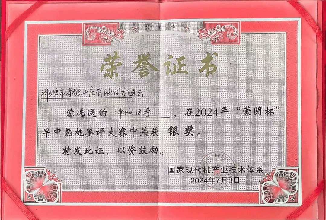 在2024年“蒙阴杯”中早熟桃赛桃会上,潍坊孝德山庄生态农场选送的黄肉油桃凭借其糖度高、果香浓郁、肉质细腻等特点,从全国300多个参赛品种中脱颖而出,荣获大赛银奖。这是继2022年、2023年连续斩获山东省赛桃会金奖后,安丘蜜桃产业在全国舞台上取得的又一重要突破。这个奖项不仅是对孝德山庄品种改良技术的肯定,更是安丘蜜桃产业高质量发展的缩影。
